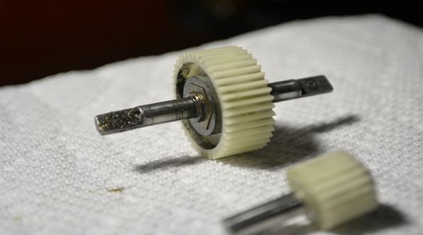 As suspected, there looks to be some filings in here, mostly plastic. We are not going to reuse the original gears anyways. Everything will be cleaned thoroughly before it is used again.
